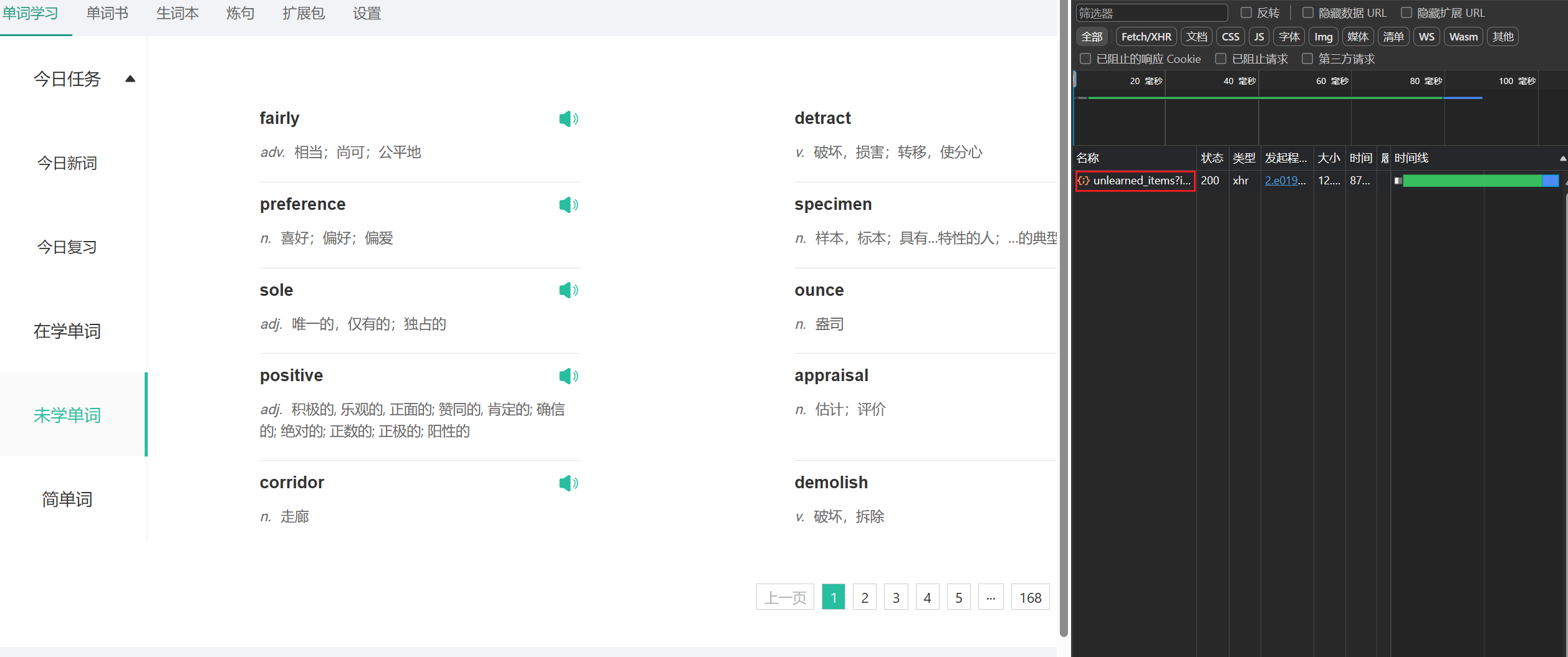 打开扇贝官网,点击分页,我们可以看到,每次点击分页都是去请求一次接口获取到数据的,那么我们要爬取的单词,直接从接口中获取就好了
